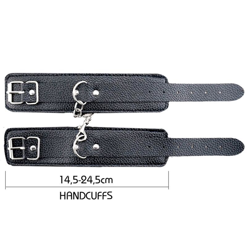 La couleur noire Dimensions : Bracelets de cheville : 21,5 – 31 cm Fouet : 49 cm Mâchoire : 40 – 58 cm Masque : 19,5 cm Collier et laisse : 35,5 – 45 cm // 96 cm Corde de maintien : +/- 5 cm Menottes : 14,5 – 24,5 cm