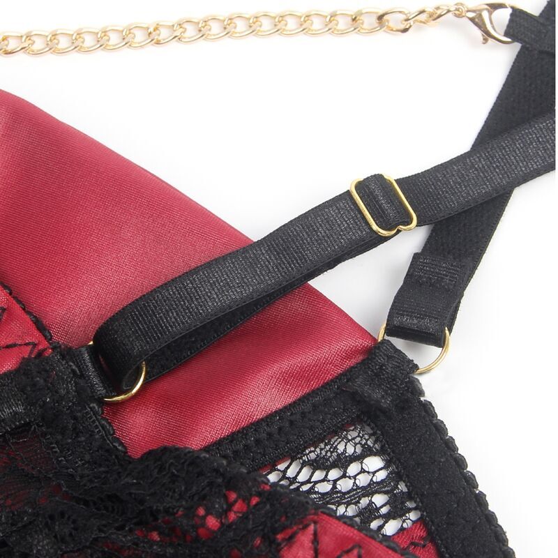 Cet ensemble corset et string est une expression de sensualité et de style audacieux. Le corset, d’une teinte bordeaux profonde, présente un design élégant avec des détails en dentelle qui ajoutent une touche de féminité et de sophistication. La particularité de ce corset sont les chaînes amovibles qui ajoutent un élément de fétichisme et de sensualité, créant un contraste fascinant avec la dentelle et le tissu en simili cuir.