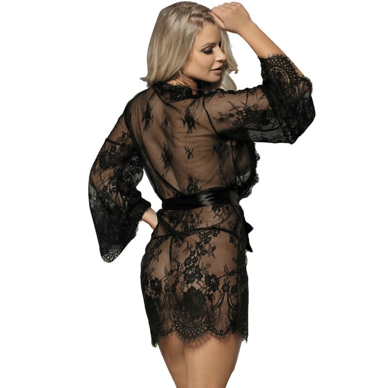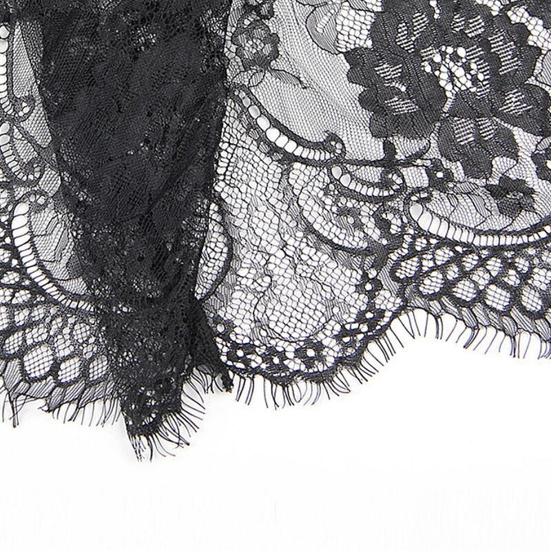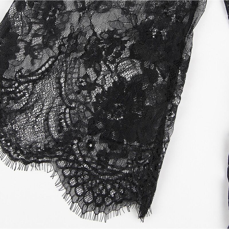 La robe courte présente un design séduisant en dentelle noire avec des détails de cils sur les manches et l’ourlet. Ses manches longues ajoutent une touche de sophistication, tandis que la dentelle délicate ajoute une touche de féminité et de glamour.
