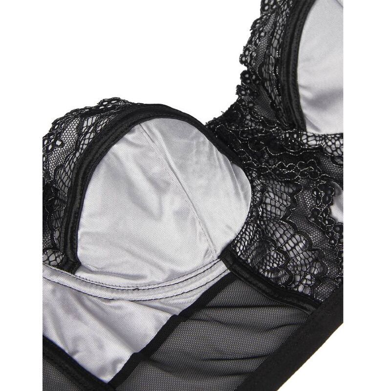 Le soutien-gorge présente un design à armatures qui rehausse et définit considérablement votre décolleté, tandis que la maille délicate ajoute une touche de sensualité et de mystère. Les bonnets sont conçus pour le maintien et le confort, tandis que les détails en dentelle ajoutent une touche d’élégance et de féminité.