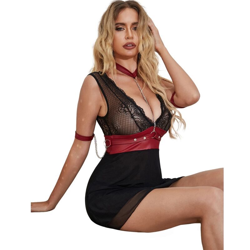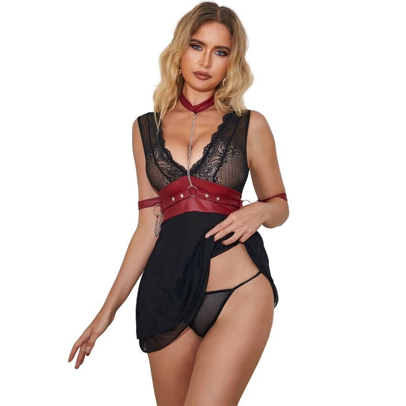 Cette nuisette est une pièce de lingerie audacieuse et provocante qui combine des éléments sensuels avec une touche de bondage. Fabriquée à partir d’un mélange de maille noire, de dentelle et de simili cuir, cette nuisette présente un design unique qui allie délicatesse et audace.