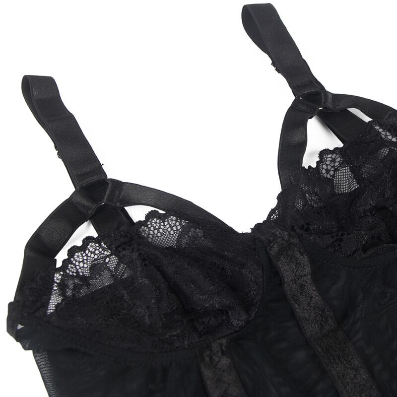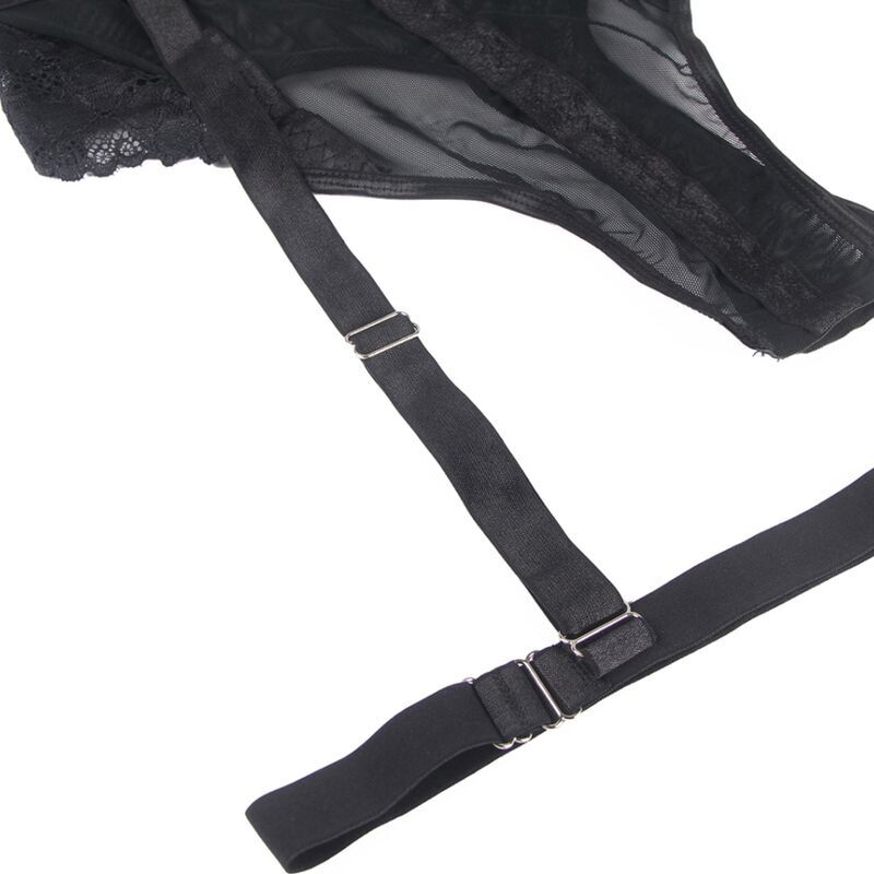 Le teddy a un style slim qui met en valeur les courbes du corps, tandis que la dentelle ajoute une touche de sophistication et de sensualité. L’inclusion d’une jarretière en haut d’une jambe ajoute une touche supplémentaire de séduction et de glamour.
