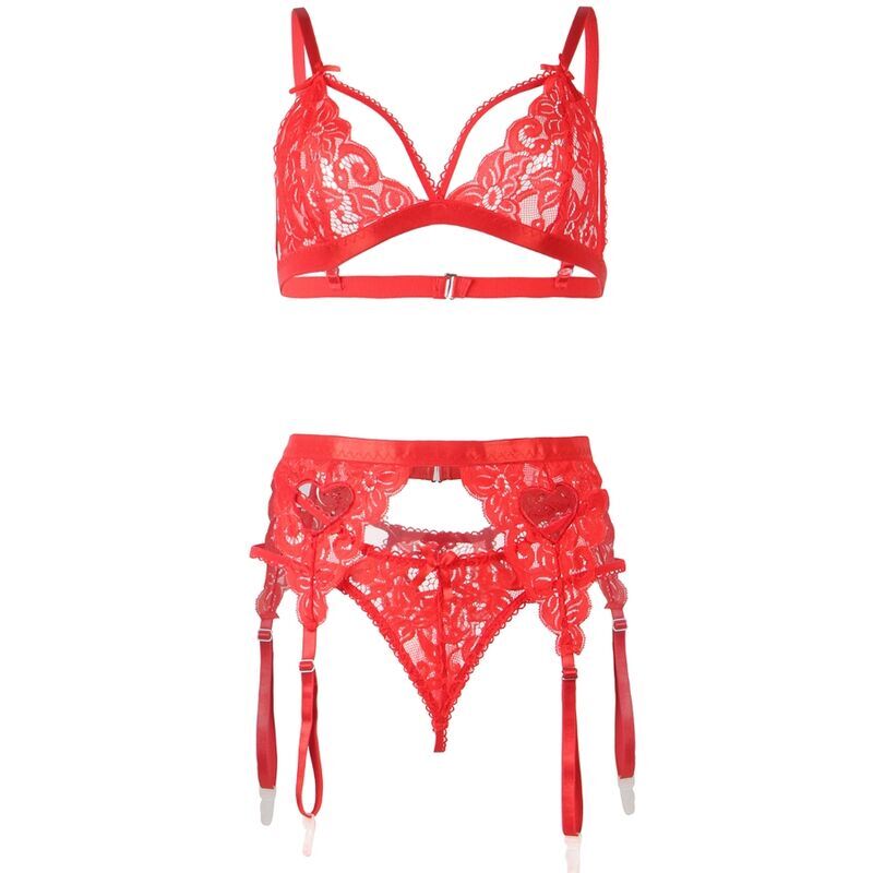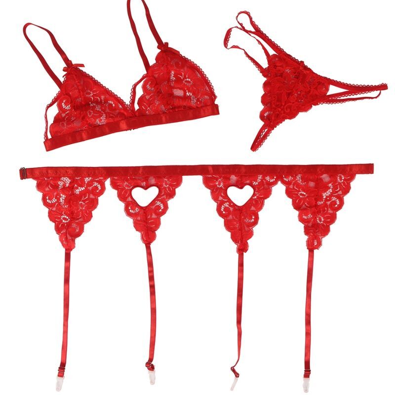La couleur rouge intense ajoute une touche de passion et d’érotisme, parfaite pour une occasion spéciale ou pour surprendre votre partenaire. Cet ensemble de lingerie trois pièces est le choix parfait pour un look séduisant et sophistiqué.