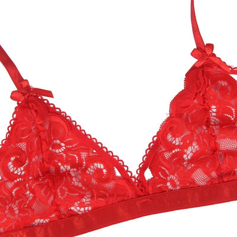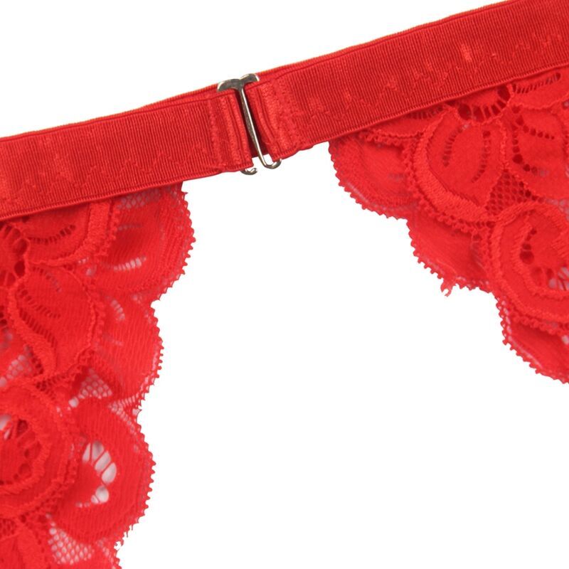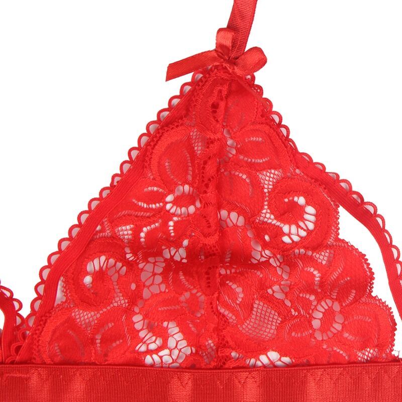 Le soutien-gorge présente un décolleté en V profond qui met en valeur la poitrine de manière élégante et séduisante, tandis que la dentelle rouge ajoute une touche de passion et de romantisme. Le porte-jarretelles en forme de cœur pêche ajoute un élément ludique et séduisant, élevant l’ensemble à un niveau de charme unique.