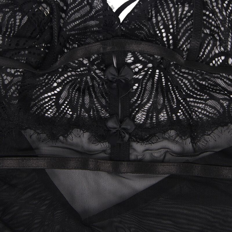 Le string assorti complète la nuisette, réalisée à partir de la même dentelle noire et offrant une coupe ajustée et flatteuse. Ensemble, la nuisette et le string créent un ensemble irrésistible qui rehaussera à coup sûr la confiance et la sensualité de celle qui la porte.