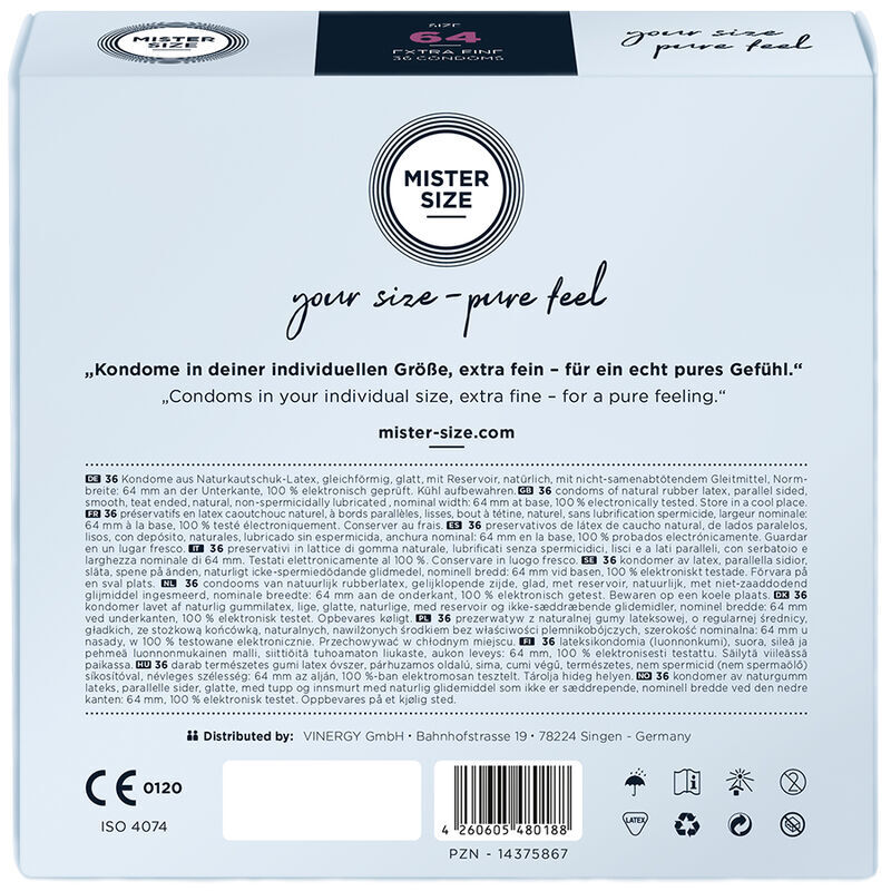 MISTER SIZE vous offre une toute nouvelle sensation lors des rapports sexuels tout en offrant une sécurité optimale. Tous nos préservatifs MISTER SIZE sont conformes à la norme DIN EN ISO 4074:2002 et sont soumis à des tests approfondis. Avoir un préservatif avec une sécurité optimale crée une confiance et une sécurité qui vous permettent à tous les deux de vous détendre et de vous laisser aller complètement pendant les rapports sexuels.